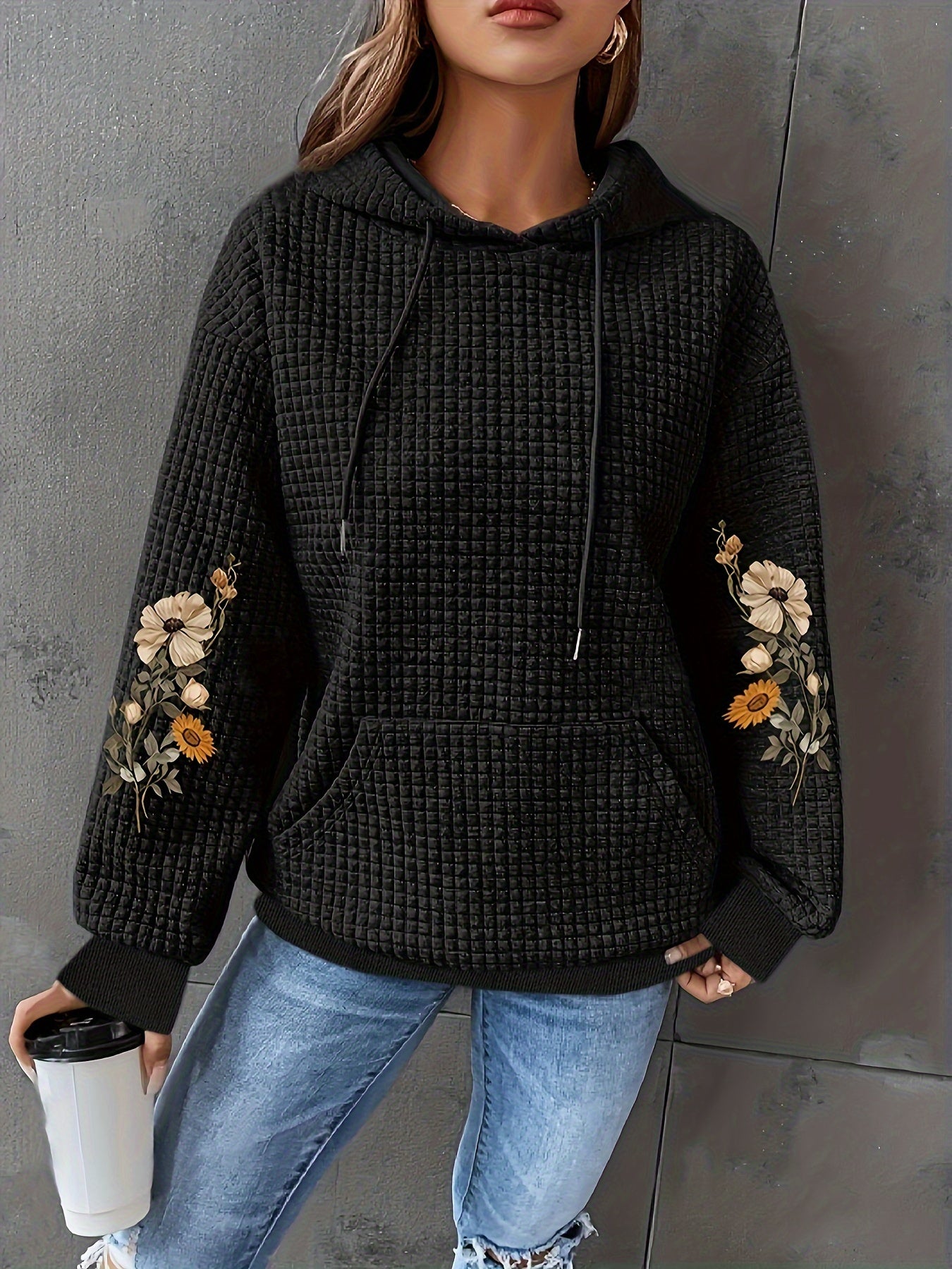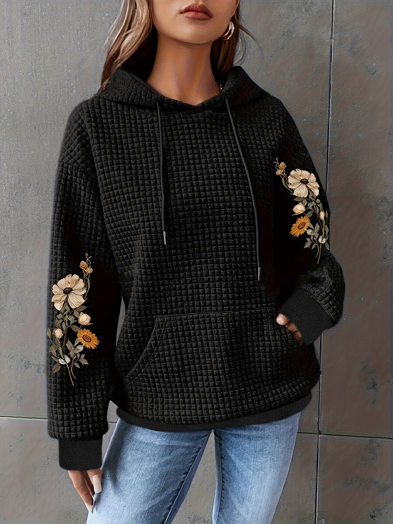 Black Floral Print Waffle Hoodie
